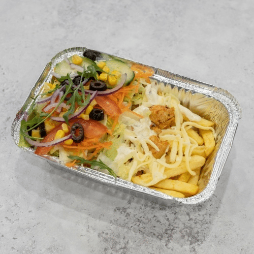 Champignons, paprika, ui, mais, feta kaas, keuze uit döner en kip met salade mix, frieten en saus naar keuze.